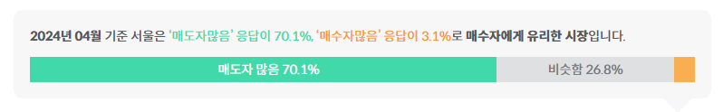 2024년 4월 기준, 서울 아파트 시장은 매수자에게 유리한 상태로 나타나고 있습니다. 현재 매수 우위 지수는 33으로, 매도자가 매수자보다 훨씬 많은 상황입니다. 구체적으로 매도를 원하는 사람이 70.1%인 반면, 매수를 희망하는 사람은 3.1%에 불과합니다. 이런 상황은 매수자가 좀 더 유리한 조건에서 아파트를 구매할 수 있는 좋은 기회로 보여질 수 있습니다.