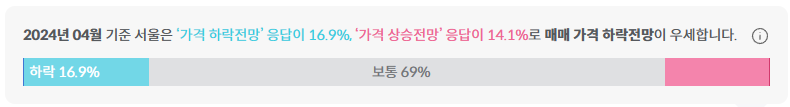 2024년 4월 서울특별시의 부동산 매매 가격 전망을 살펴보겠습니다. 서울에서의 주택 가격은 대체로 안정적일 것으로 보입니다. 조금 더 자세히 들어가면, 소폭 상승 예상은 14%로 가격이 크게 변하지 않을 것이라고 보는 분들이 69%로 가장 많습니다. 소폭 하락 예상은 16.7%입니다. 그리고 가격이 많이 떨어질 것으로 예상하는 분들은 0.2%에 불과합니다.