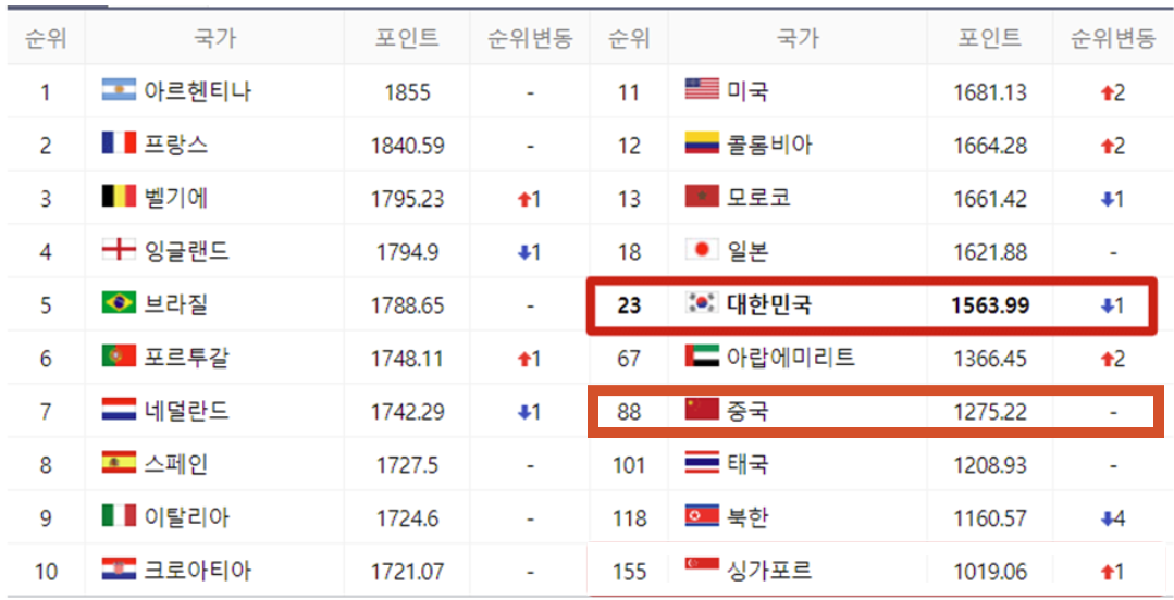 대한민국 FIFA 랭킹 : 23위